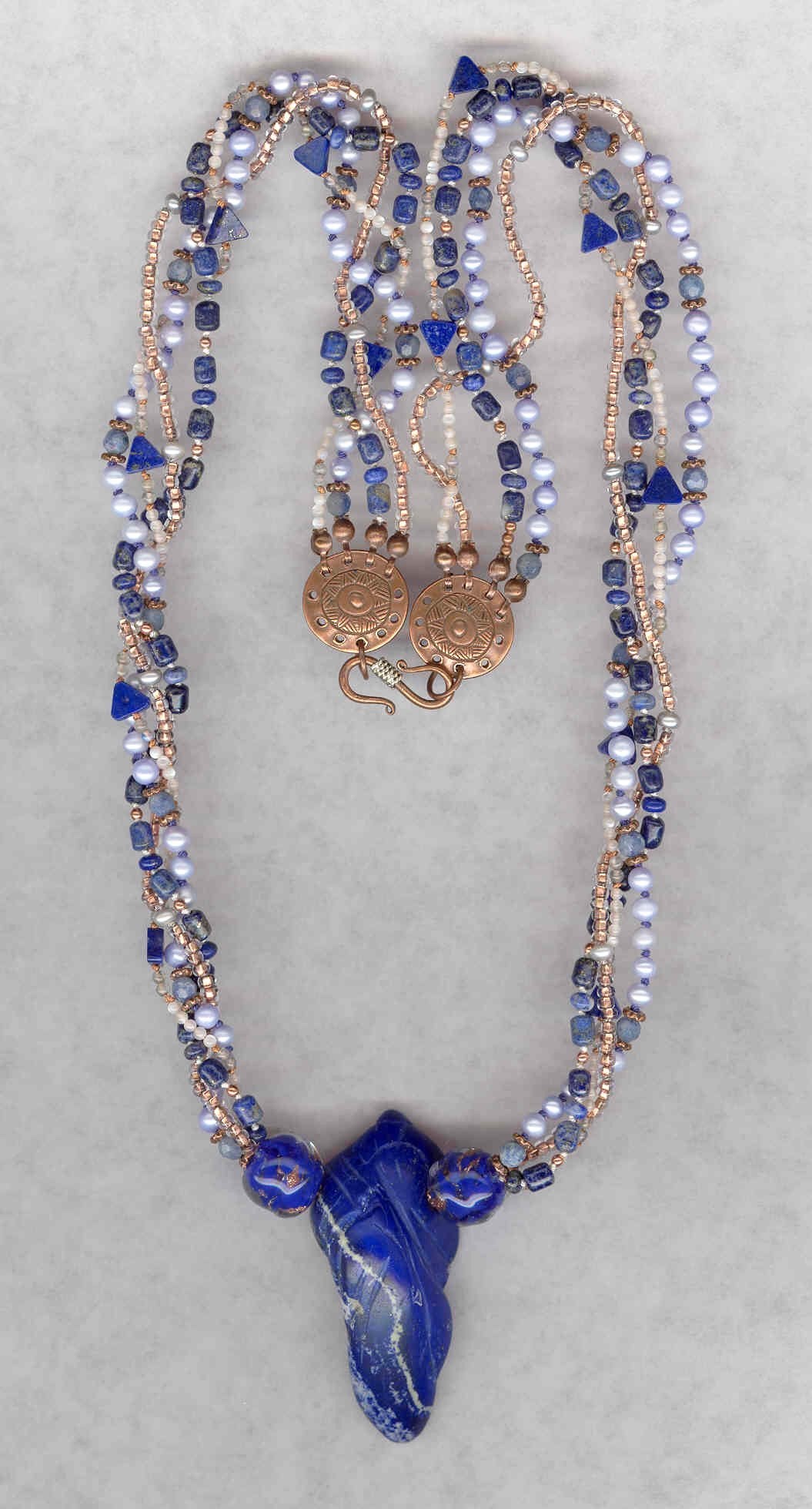 This unique multi-strand necklace features an unusual, carved lapis lazuli pendant at its center. The lapis captures the dark blue of the sky as sunlight...