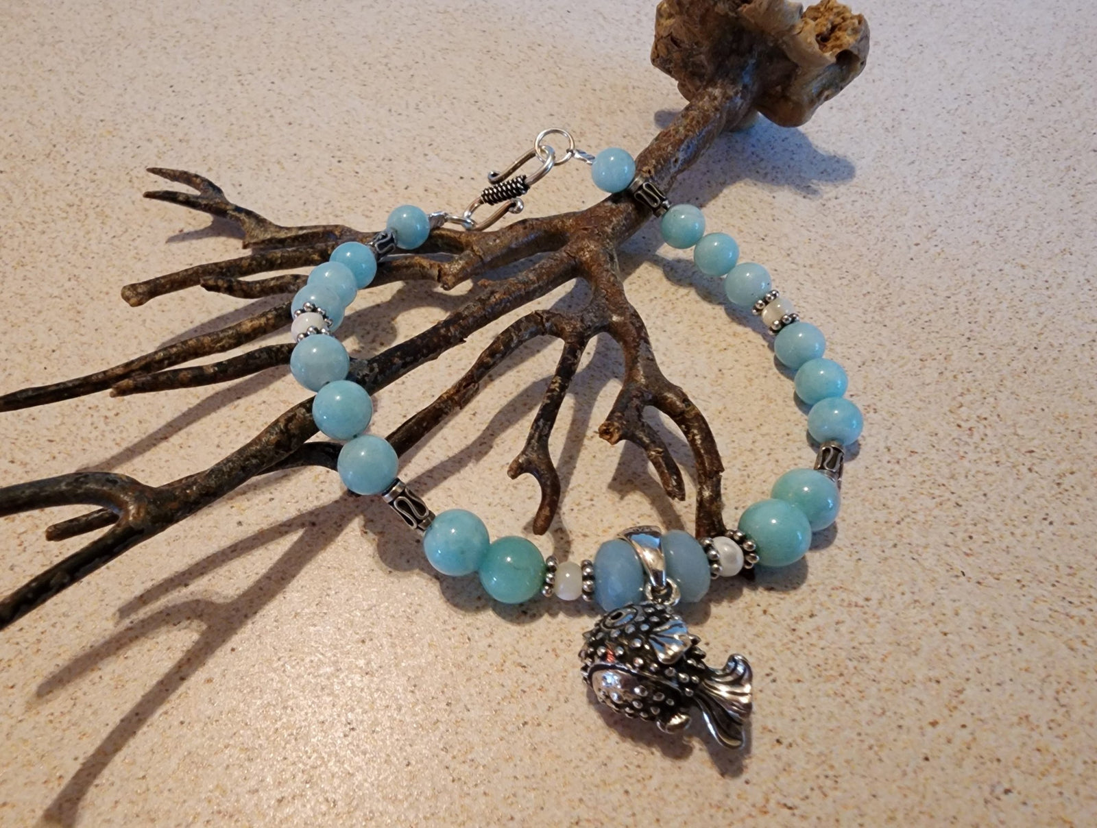 At the center of this adorable 7.75" bracelet is a sterling silver pufferfish charm. The bracelet is made of gorgeous Amazonite and Mother of Pearl...