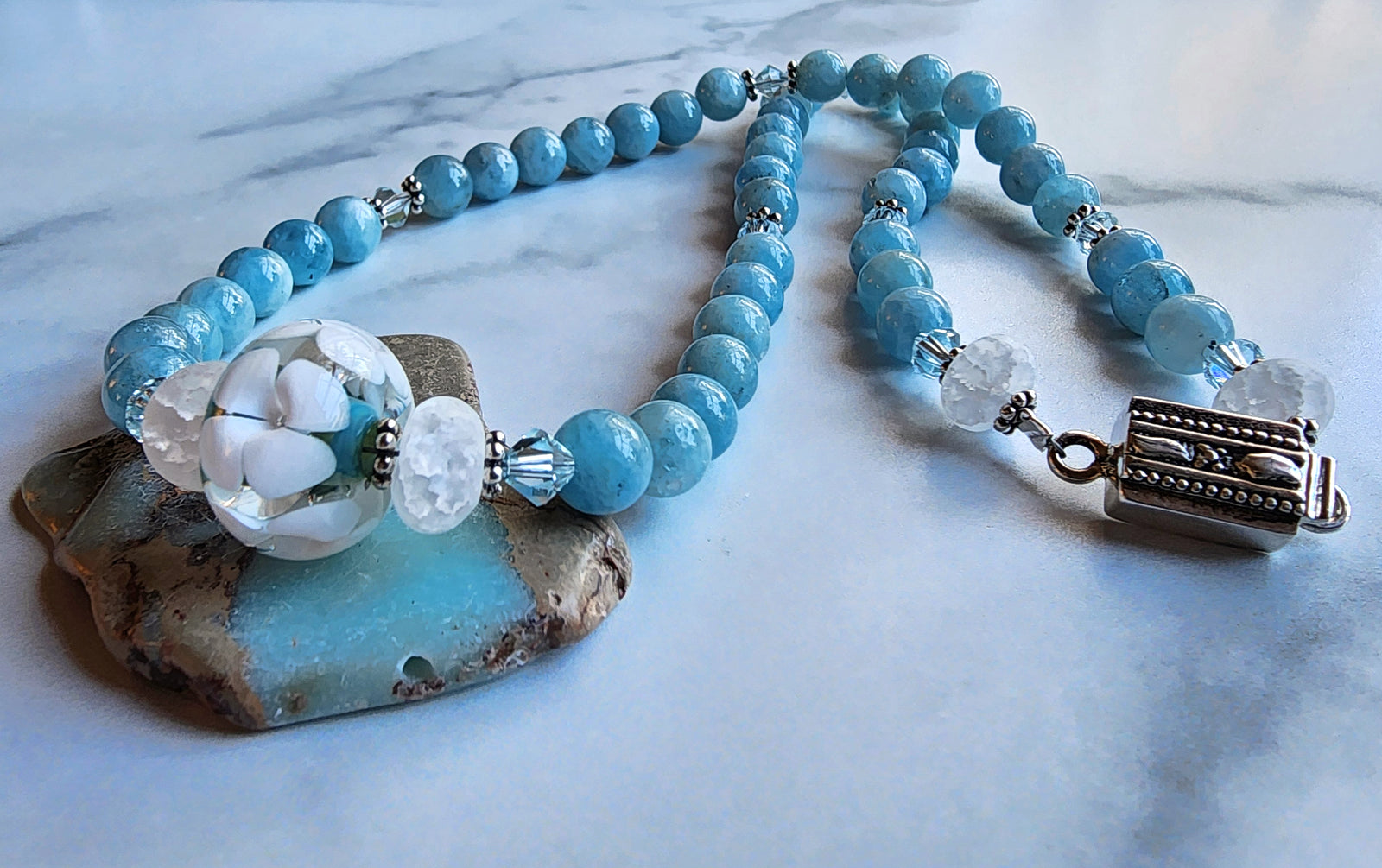 The center bead in this 18.5" beaded necklace is a lovely lampwork glass floral bead. It is paired with gorgeous Aquamarine beads, Swarovski crystals, sterling...