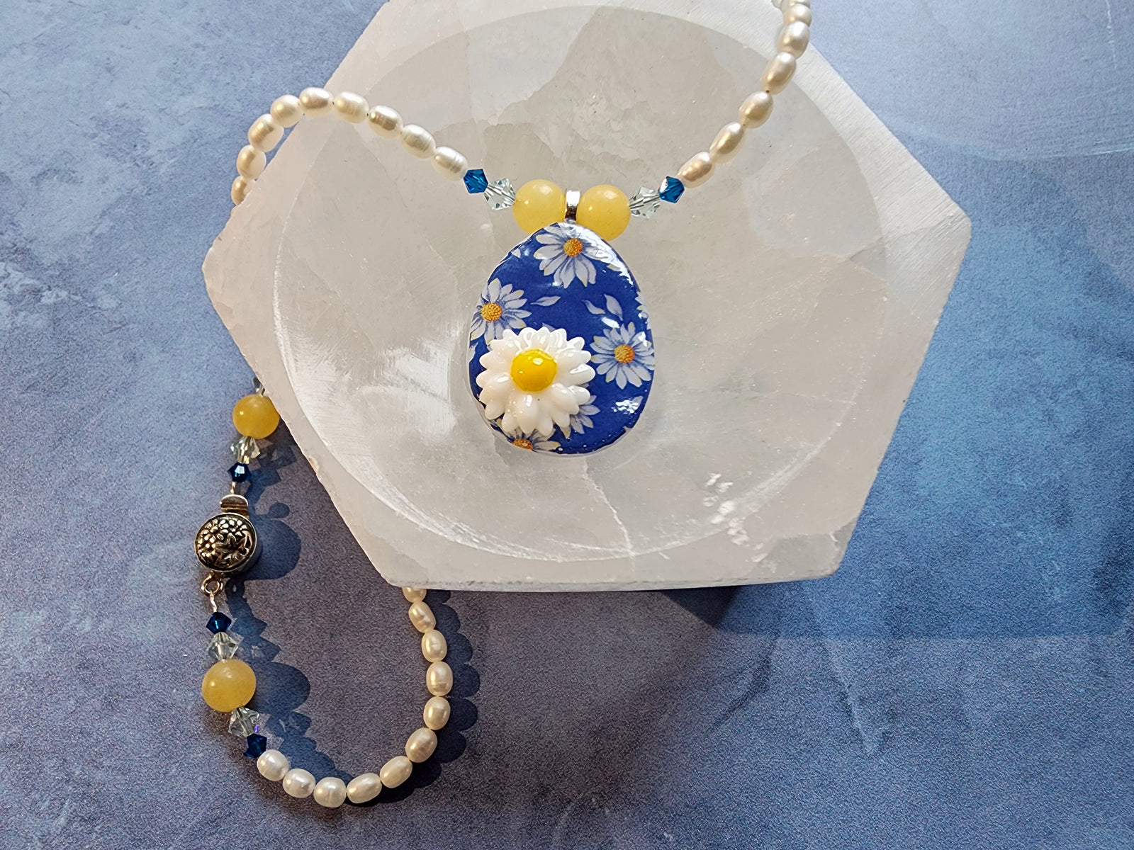 This Daisy Pearl Necklace showcases a stunning ceramic daisy flower pendant by KKrafts, accented with Yellow Jade, Swarovski crystals, and freshwater pearls. Its elegant...