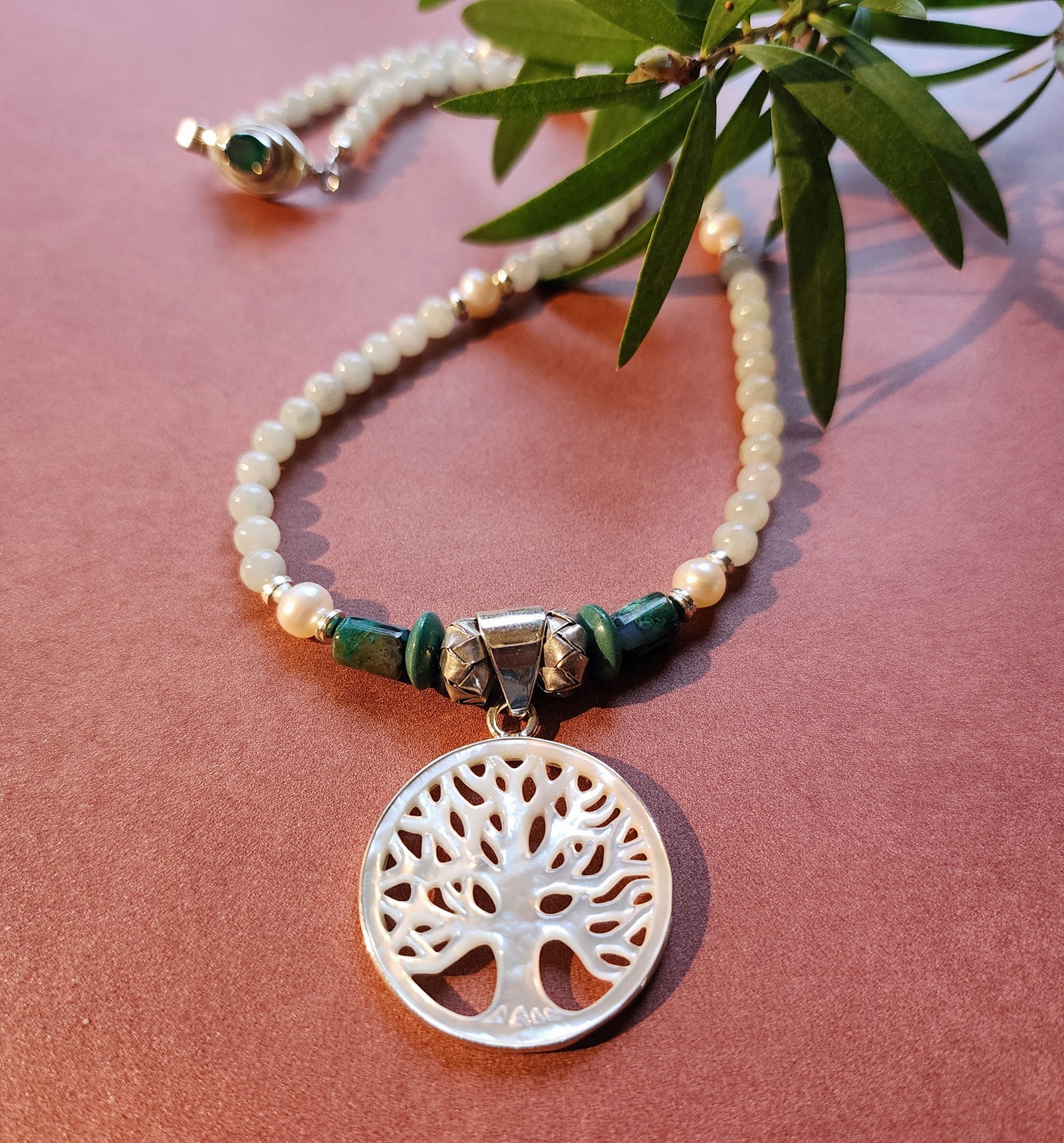 Inspire harmony and prosperity with our Jade and Mother of Pearl Tree of Life Necklace. The sterling silver pendant is crafted by expert Charles Albert,...