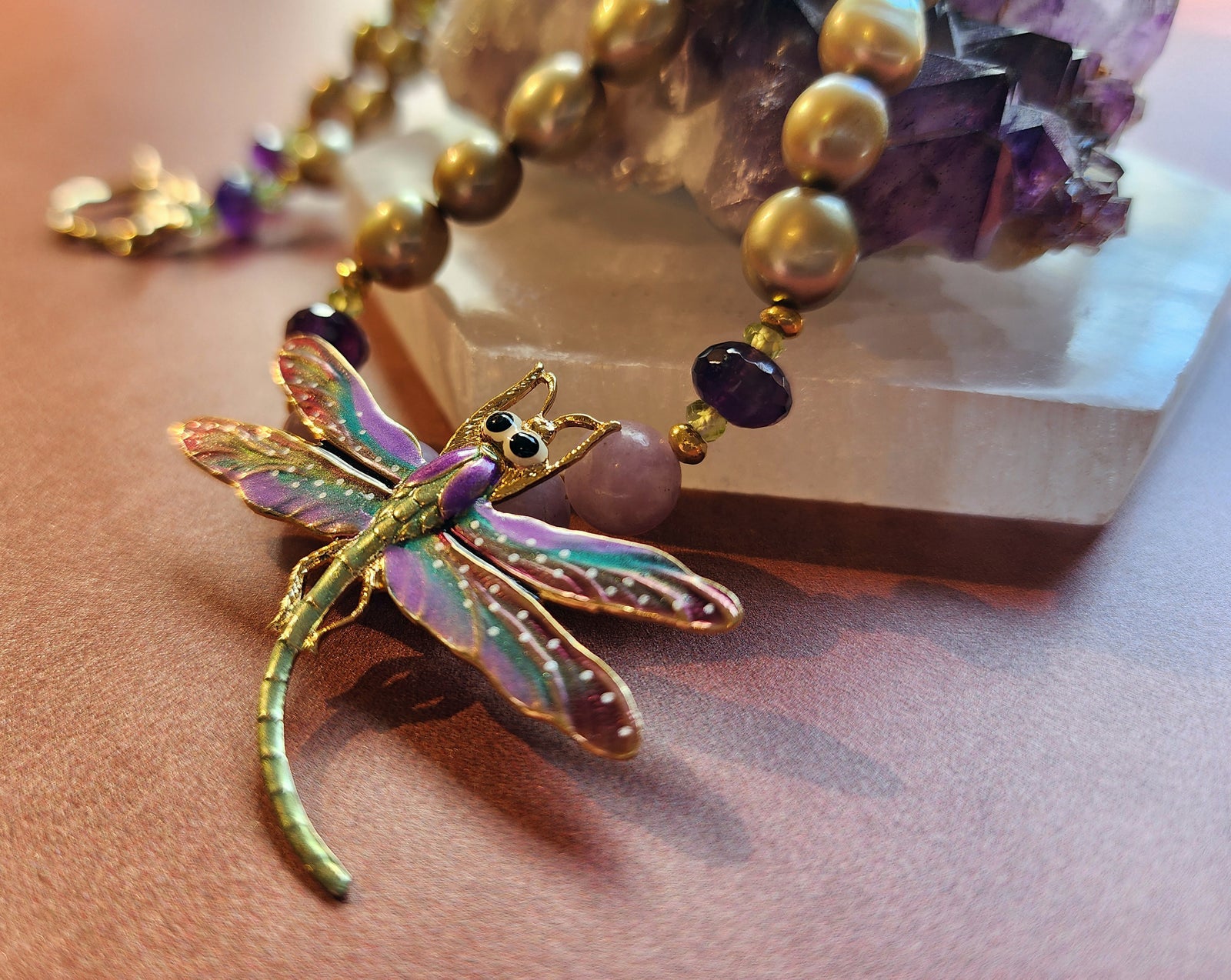 Expertly crafted with a whimsical dragonfly button from Susan Clarke, the Pearl Dragonfly Necklace showcases stunning Lepidolite, Amethyst, Peridot, and freshwater pearls. Embellished with Swarovski...